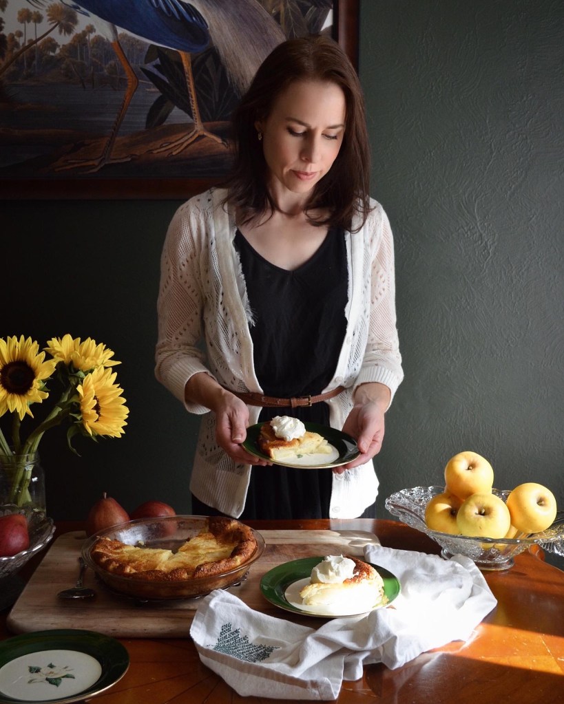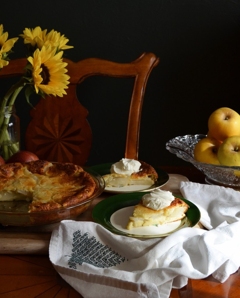 Arrange the pears in overlapping circles in the prepared pan. Pour the egg mixture over top, being careful not to disturb the pears. Give the pan a few taps on the counter to make sure there aren’t any air bubbles. Place on a sheet pan and bake in the preheated oven for 30 – 35 minutes, until the edges are brown and the center is set.